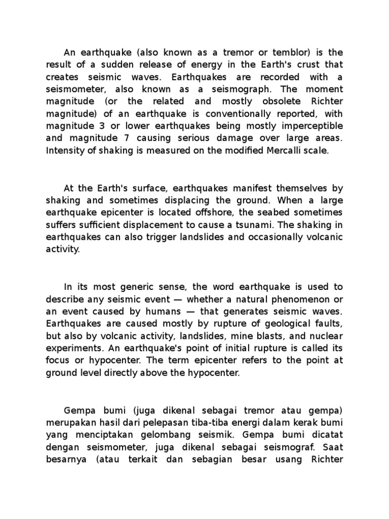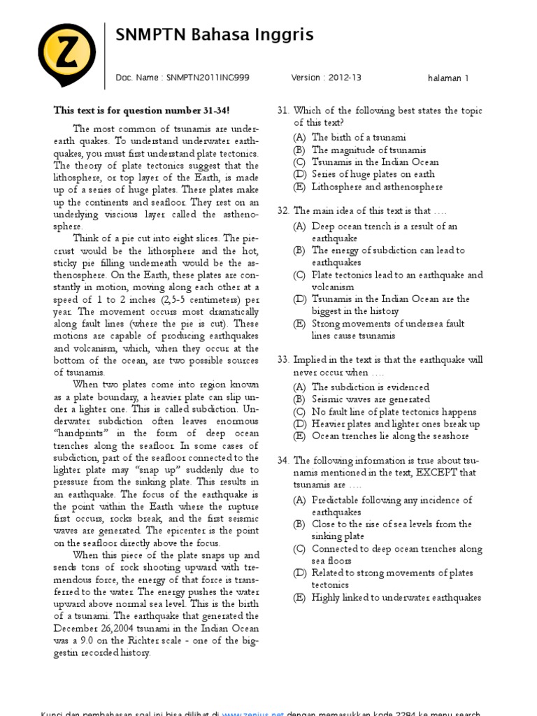 The number of people injured in the weekend earthquake in the central sulawesi capital of palu reached 26. It's a fort, or a clubhouse, where i can go with friends. Semakin banyak perbendaharaan kata atau vocabulary yang kamu ketahui, kamu bisa dengan mudah mengetahui makna dari kalimat tersebut. Choose the correct answer by crossing (x) a, b, c, or d ! Choose the sentence that is written correctly. Tidak ketinggalan juga sekolah smk tempat saya bertugas. Because it destroys the coastal area. Sbmptn 2016 bahasa inggris soal doc. When two blocks of rock or two plates are rubbing against each. Read the text to answer questions 1 to 4. Because it can make an earthquake. It make the ground shake. From the fire that followed.